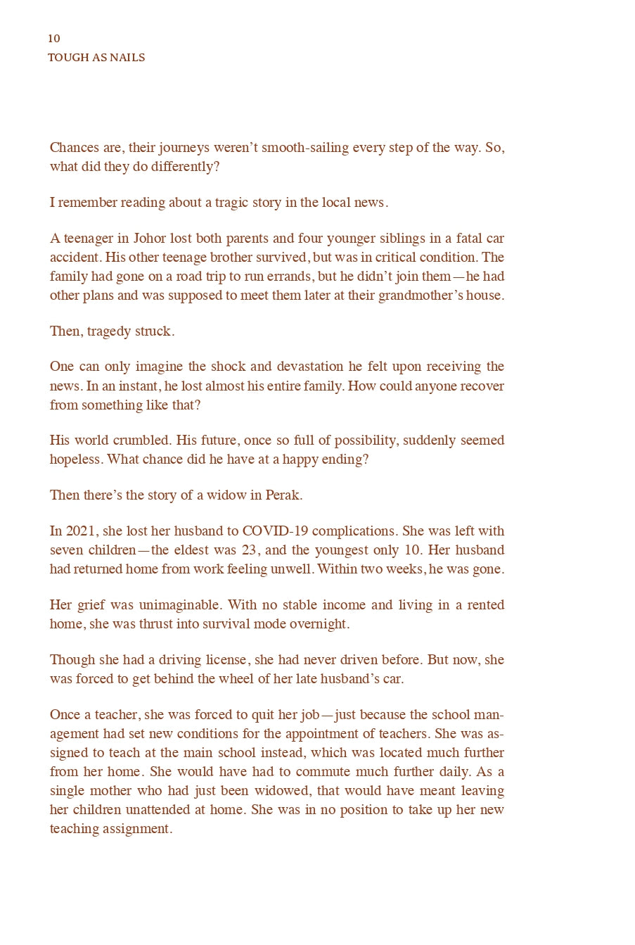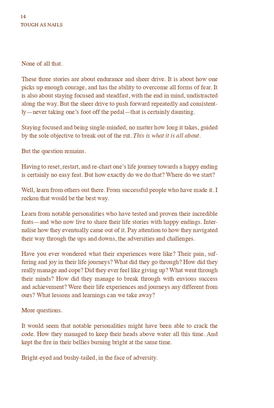 Tough As Nails brings together the real-life journeys of eight people from all walks of life — well-known achievers and unsung heroes — who faced extraordinary setbacks, struggles, and losses, yet found the courage to rise again. Each story reveals not only their pain and despair but also their resilience, grit, and hope. From tragedy to triumph, these stories shine a light on how determined individuals can endure extraordinary challenges.